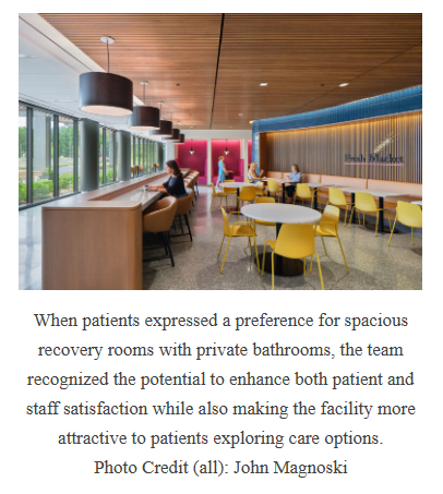 One project for a community health system exemplified this challenge when patients expressed a preference for spacious recovery rooms with private bathrooms—contrasting with the initial design, which prioritized square footage efficiency by omitting dedicated toilet rooms in prep/recovery areas. During later design phases, the team integrated private bathrooms, recognizing their potential to enhance both patient and staff satisfaction while also making the facility more attractive to patients exploring care options.